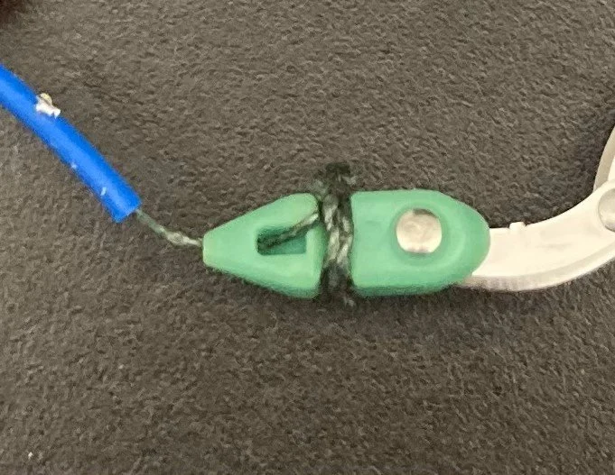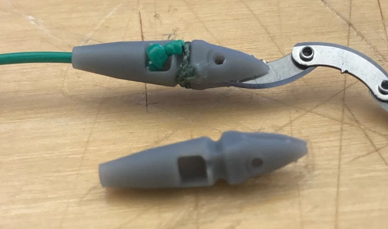 The cutting force of Lattis consists of four chains of seven stainless steel blades riveted together and bound to woven lines of Spectra. The Spectra is thread through 4 different colors of PTFE to differentiate during cutting. An issue arose during testing wherein the PTFE shrinks back, exposing the Spectra to being cut. Combined with the bulky shape of the green blade connector, the lines were getting stuck during the process of cutting through the specimen. I redesigned the connector to have a streamlined shape, and to retain the PTFE itself to combat stretching.