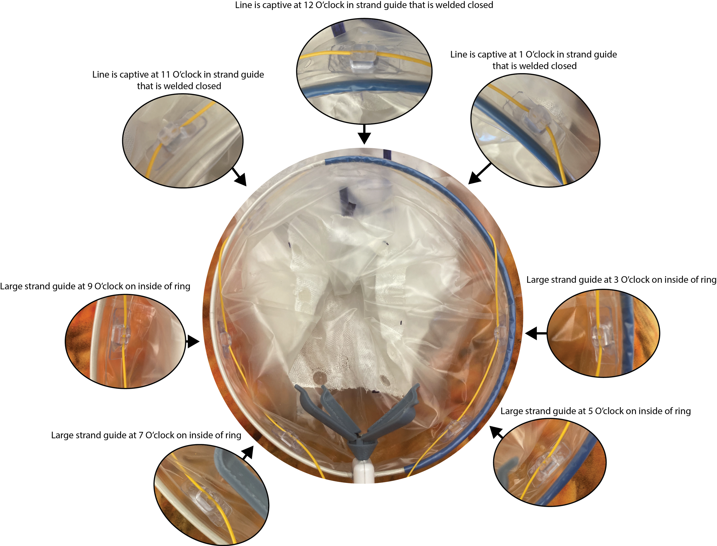 An important aspect of the process is securing the specimen within the pouch. During the procedure, the surgeon is operating in pseudo-blindness. It is important to give them control and tactile feedback to work alongside the small scope of vision supplied by surgical cameras. The purpose of the tether is to close the mouth of the pouch and allow the surgeon to secure the specimen in the bottom of the pouch for cutting. I was inspired by the mechanics of a fish mouth and devised a method for the opening ring of the pouch to pivot upright when the tether is pulled.