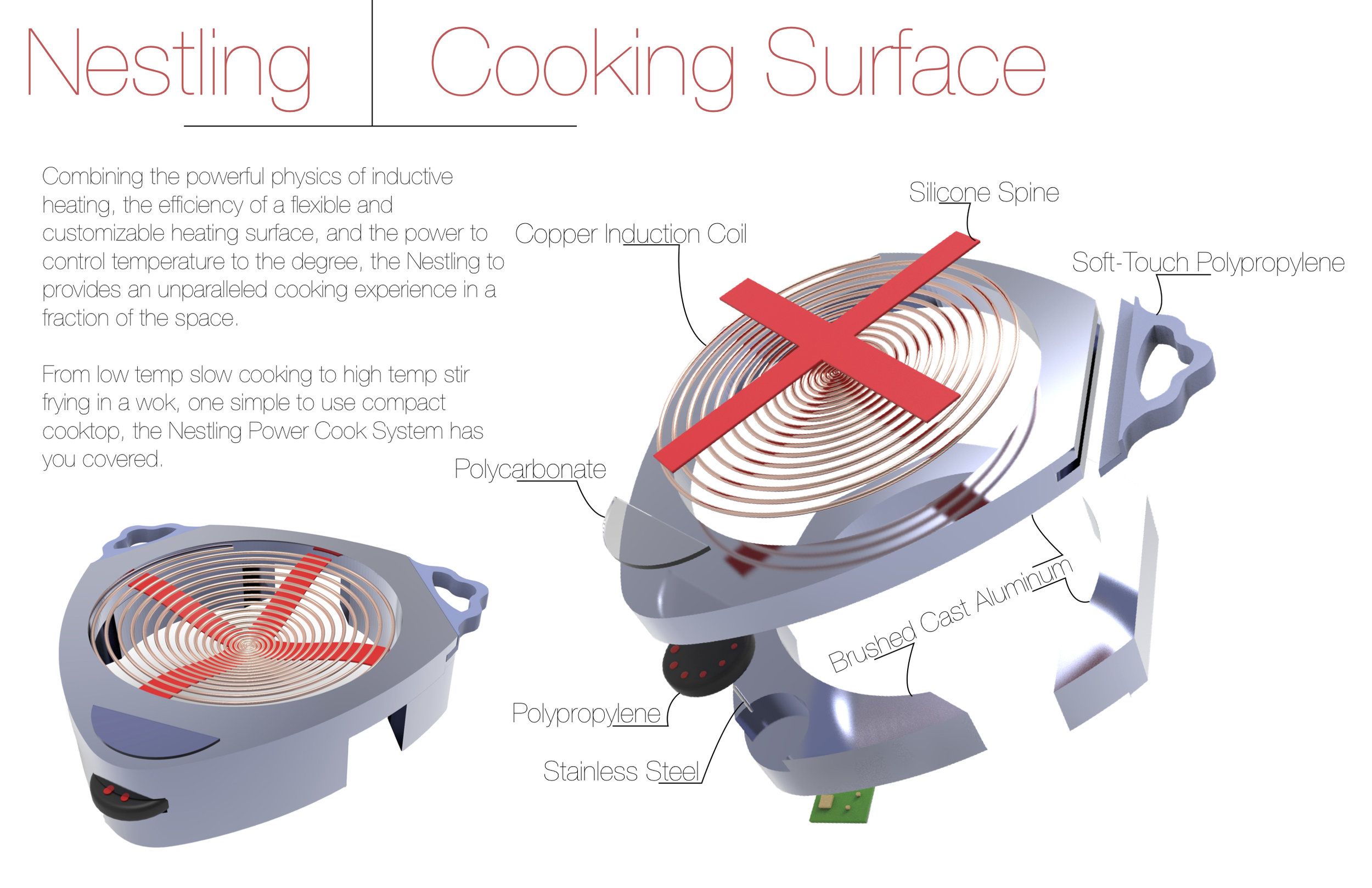 Ultimately, I sought to create a cooking product which supplies the power and three-dimensional heat distribution of fire, with the safety and sustainability of electricity. The central concept of the Nestling heating surface utilizes an electric heating coil that is flexible, conforming to any cooking vessel. This allows the user to complete many cooking tasks with greater efficiency, convenience, and improved performance. It does this safely through the inductive heating of a coil embedded in silicone.