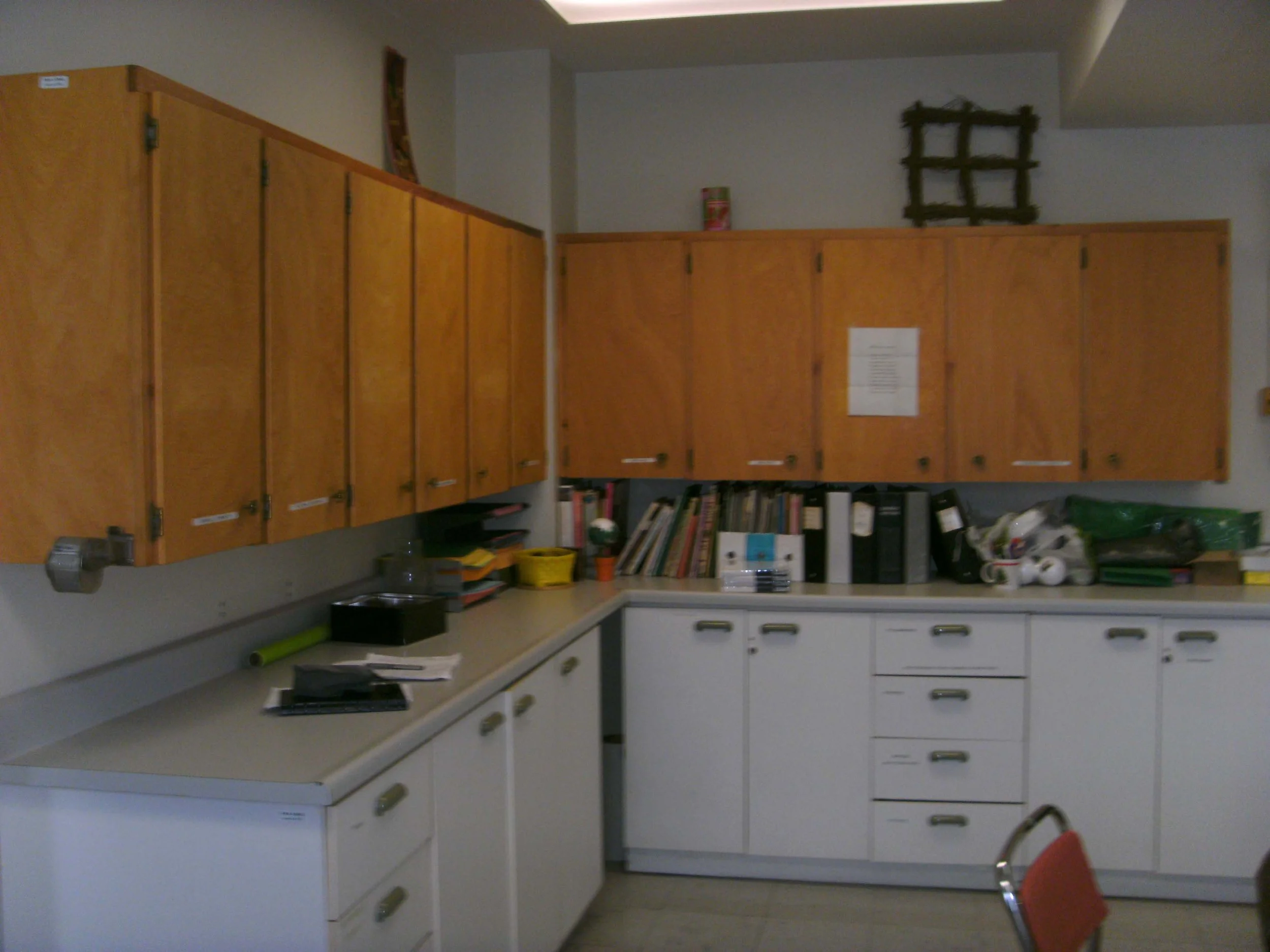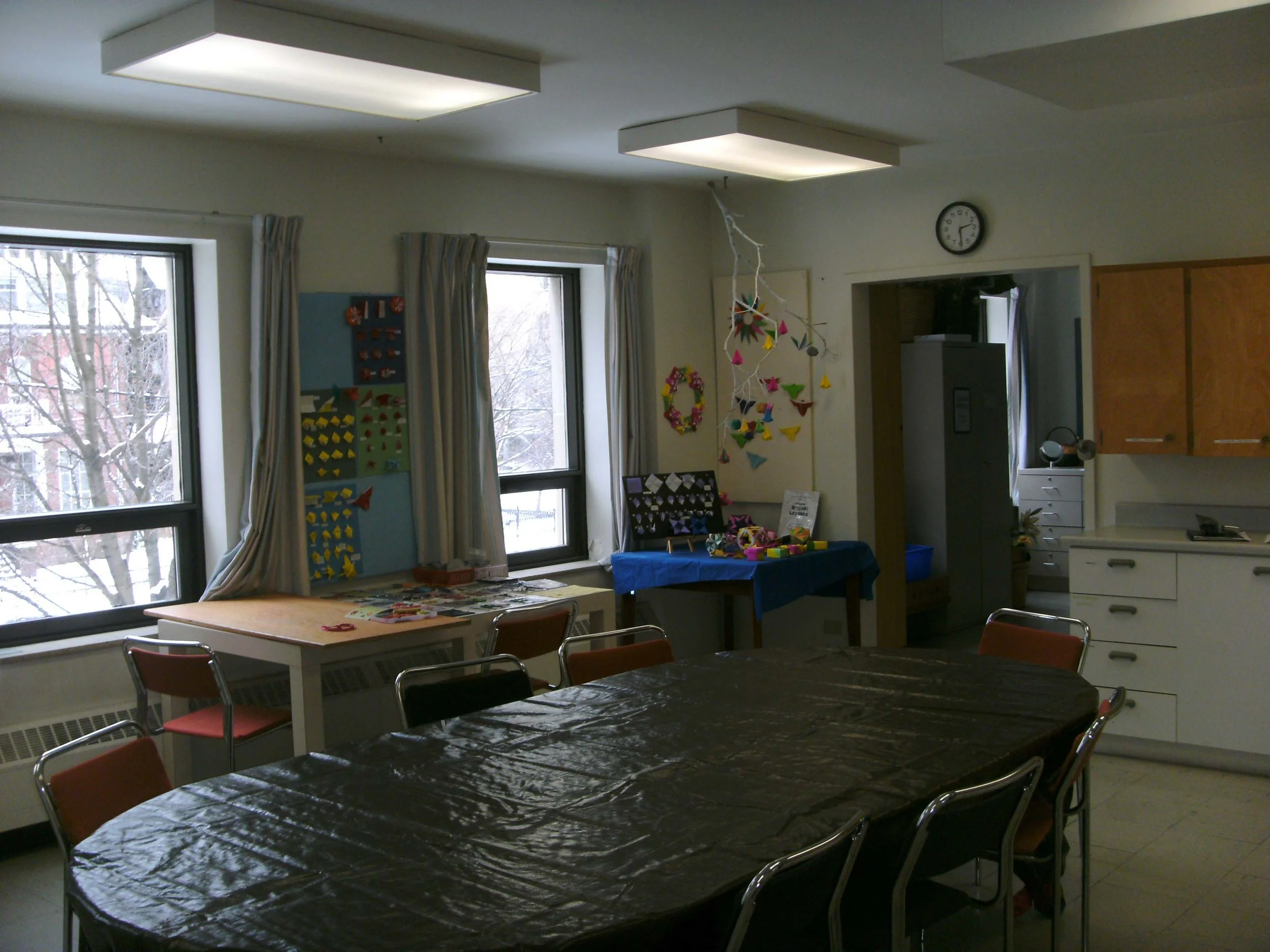 On patient request, a rack was provided which can store craft materials such as yarn, fabric, paints, etc. The rack swivels to reveal an ironing table. Rack stores flush against the wall.
