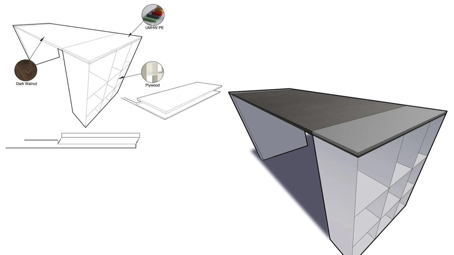A crafts table was designed with storage in the legs and UMHW polyethylene inset on the end to act as an inset cutting board while providing protection to the table.