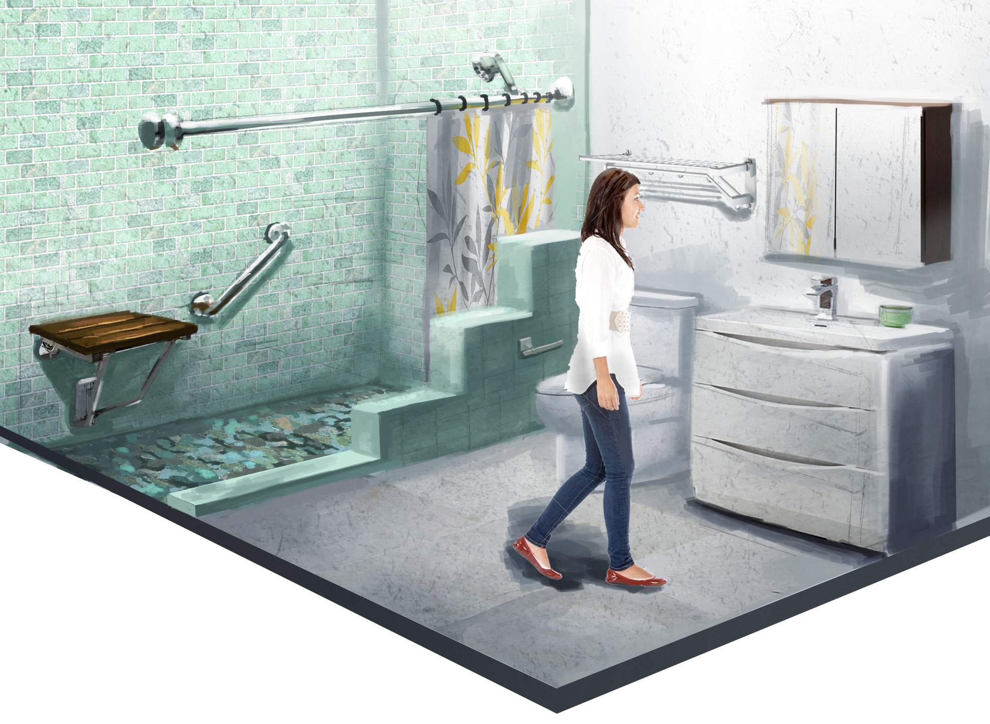 The bathroom uses an aquatic motif in greens and blues, with natural stone elements to aid in relaxation. Improvements include a shower renovation to remove the lower lip, a fold out seat, and a textured stone floor in the shower to increase friction to reduce chance of slipping as well as to massage the feet.