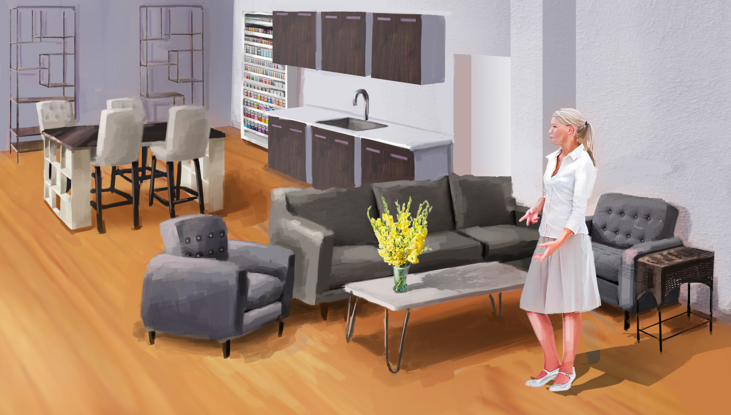 Warm greys and shades of lavender promote creativity while maintaining a sense of sophistication in the lounge area. Exposed wooden flooring gives off a warm, inviting energy and is easy to maintain. A craft area is supplied with a storage rack and a table with additional storage.